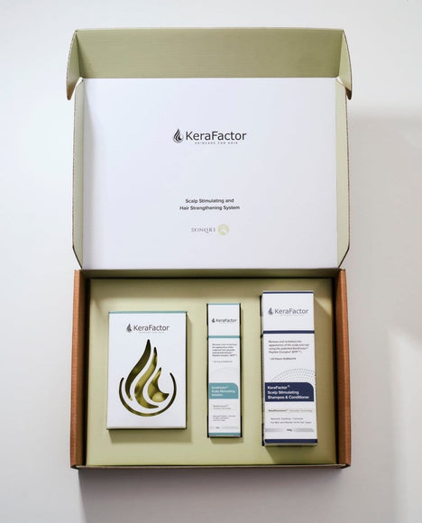 Each highly concentrated 50ml bottle of KeraFactor Solution contains the proprietary KeraFactor Peptide Complex (KFP™). KFP is a unique formula that contains 7 Polypeptides that include both specifically selected growth factors and skin proteins to help with hair and scalp health. This patented complex helps to "turn on" weak or resting hair follicles and improve scalp circulation and nutrients to produce thicker, longer healthy-looking hair.