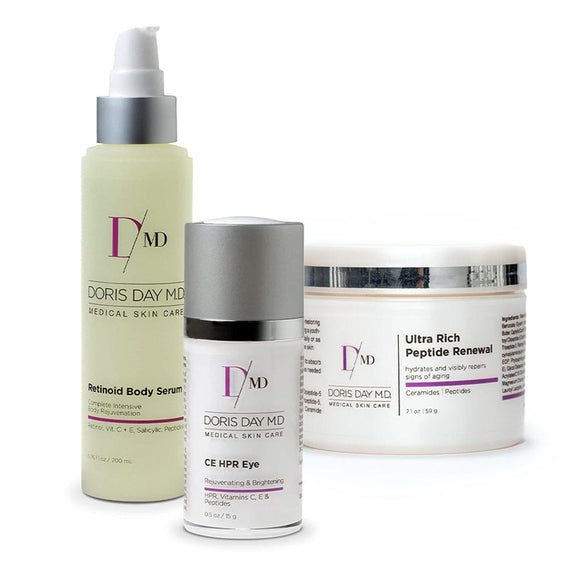 Inspired by the science of skin regeneration, this curated trio brings together advanced formulas designed to elevate every part of your routine. Featuring Body Retinol, CE+HPR Eye, and Ultra Rich Peptide Renewal Cream, this bundle is the ultimate gesture of care. Thoughtfully selected to support smoother looking texture, enhanced radiance, and visibly looking revitalized skin, it’s a full-body approach to luxurious, clinically-informed skincare.